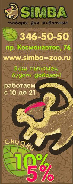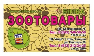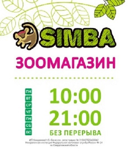 «Simba» — магазин зоотоваров Екатеринбурга. Корма для собак и кошек, игрушки для животных и многое другое вы можете приобрести как лично, так и заказав через интернет-портал зоомагазина.